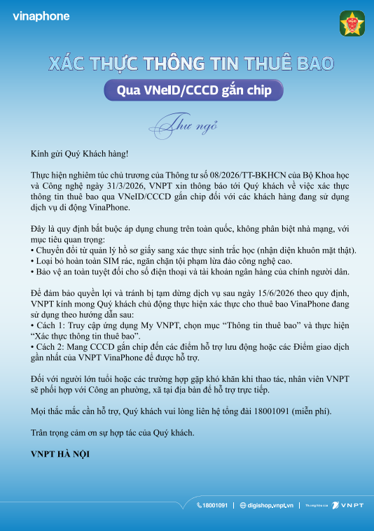 Từ 15/4/2026, Quý khách hàng lưu ý thực hiện xác thực Thông tin thuê bao theo quy định mới để không bị gián đoạn dịch vụ!